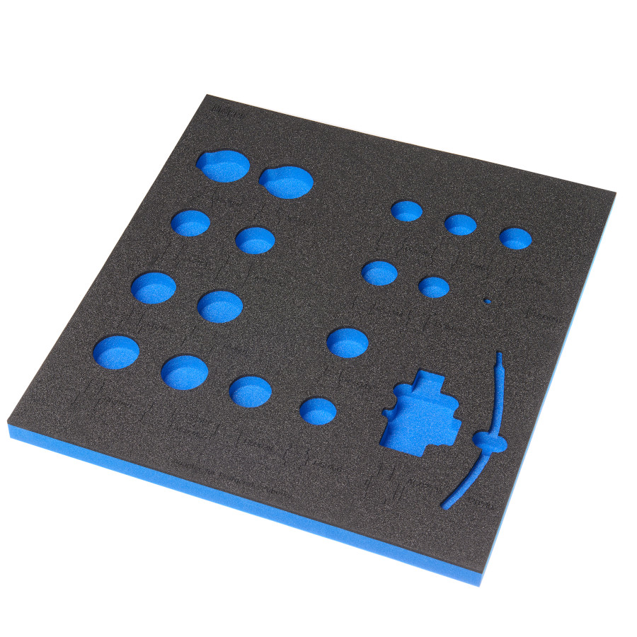 Werkzeugeinleger für Zubehör von Prüfgeräten (z. B. Quaestor), Art.-Nr. 3719880, aus Polyethylenschaumstoff, schwarz/blau, Maße: B 504 × L 530 × H 25 mm.